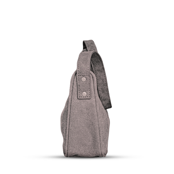 The Dazed Handbag is embroidered with mushrooms, on washed grey cotton canvas fabric, with coral colour lining. The strap is vegan.