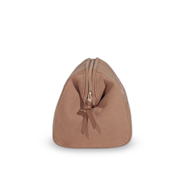 The Mycoverse Makeup Bag is embroidered with a mushroom inhabited galaxy, on milky-brown cotton canvas, with bright coral lining. The exterior and interior fabric is waterproof. There is a wireframe around the zipper opening of the bag, which enables the bag to remain open while in use.