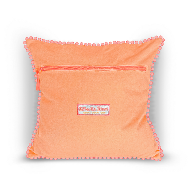 The Psyloom Cushion is embroidered with whimsical mushrooms on apricot coloured cotton canvas fabric, edged with pom poms.