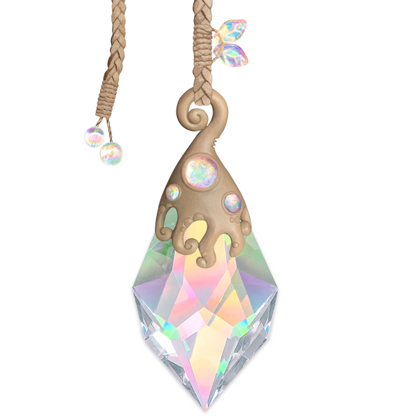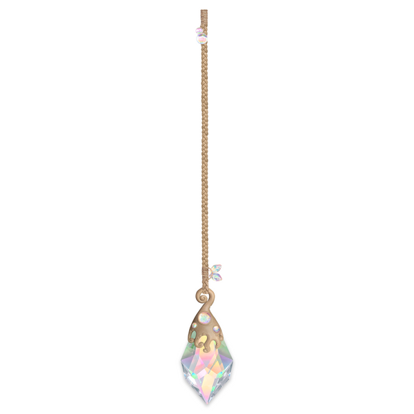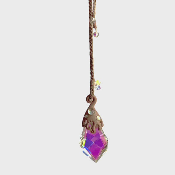 The crystal is made from Aurora Borealis coated K9 glass, hung on braided imitation suede.